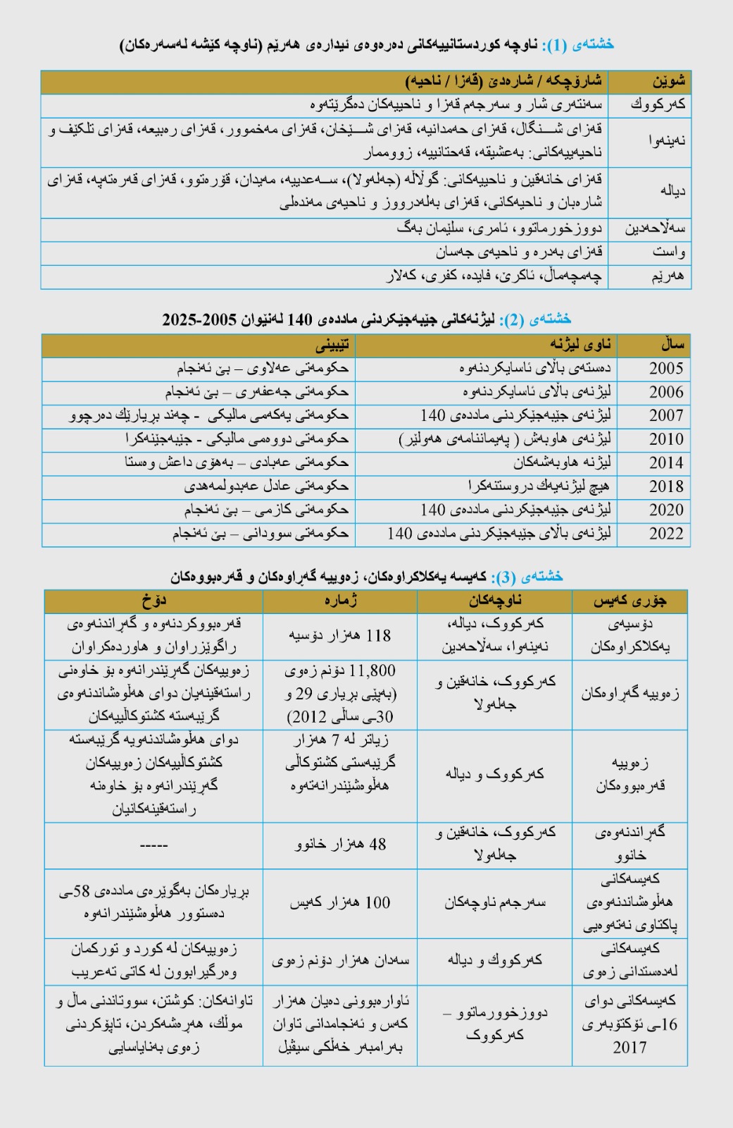 بەڵگەنامە و زانیاریی تایبەت بە ماددەی 140 دەستووری عێراقی فیدراڵ