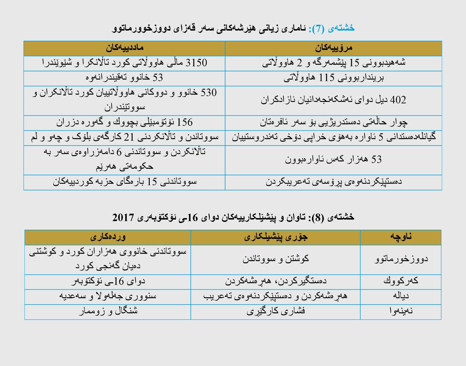 • لەدوای 16ـی ئۆکتۆبەرەوە، سیاسەتی تەعریب، لەژێر چاودێری ئیدارەی سەپێنراوی شارەکان، دەستی پێکردۆتەوە و گۆڕانکاریی گەورە لە پۆستە کارگێڕییەکان کراوە، دەیان پۆستی باڵا لە کورد سەندراونەتەوە.