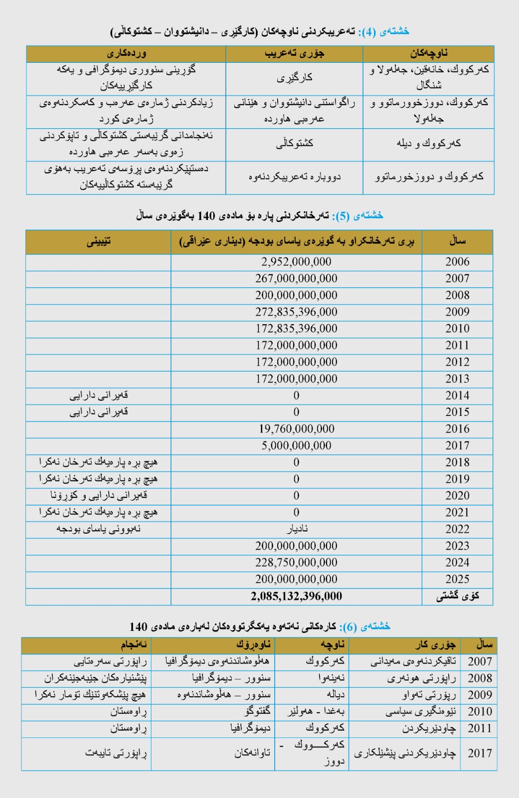 • لە 2005 تا 2025، چەندین لیژنە بۆ جێبەجێکردنی ماددەی 140 پێکهێنراون، زیاتر لە 2 ترلیۆن دیناری بۆ تەرخان کراوە و تا ئێستا جێبەجێ نەکراوە.