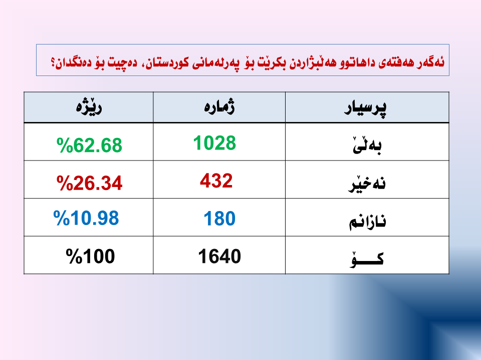 لە راپرسیەكدا كە ( رێكخراوی شار بۆ راپرسی )ئەنجامیداوەو ئەمڕۆ لە كافتریای ئەمنە سورەكەی شاری سلێمانی خرایە روو، تیایدا ( 1640 ) كەس لە پارێزگاكانی هەرێمی كوردستان بەشداریان تێداكردبوو، بەپێی راپرسیەكە ( 62%) بەشداربوەكان بەشداری لە هەڵبژاردنی داهاتووی پەرلەمانی كوردستاندا دەكەن.