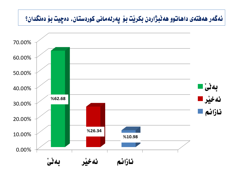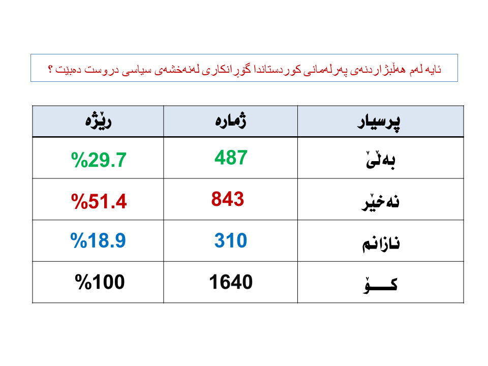 هەربەپێی راپرسیەكە و لە وەڵامی پرسیارێكدا (54%)ی بەشداربوان پێیان وایە هەڵبژاردنی داهاتوی پەرلەمانی كوردستان گۆڕانكاری لە نەخشەی سیاسی هەرێمدا درووست ناكات .