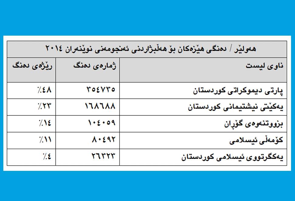 بەڵام پارێزگای هەولێر لە هەڵبژاردنی ئەنجومەنی نوێنەرانی عێراق 30/4/2014، كە (936557) هاوڵاتی مافی دەنگدانیان هەبووە و (744489) هاوڵاتیش دەنگیانداوە، پارتی دیموكراتی كوردستان توانی (354735) دەنگ بەدەست بهێنێت بەرێژەی (48% ) و ، یەكێتی نیشتیمانی كوردستان (168688) دەنگی بەدەستهێناوە بەڕێژەی (23%) و لیستی گۆڕان توانی (104059) دەنگ بەدەستبهێنێت بەڕێژەی (14%) و لیستی كۆمەڵی ئیسلامیی (80492) دەنگ بەڕێژەی (11%) و لیستی یەكگرتووی ئیسلامیی (26323) دەنگ و بەڕێژەی (4%)ی دەنگەكان بەدەست بهێنێت، بەڵام لەم هەڵبژاردنەدا رێژەی دەنگی لایەنەكان زیاتر بوو لە پارتی كە پارتی 45% و لایەنەكانی تریش زیاتر لە 50%ی دەنگەكانیان مسۆگەر كردووە.
