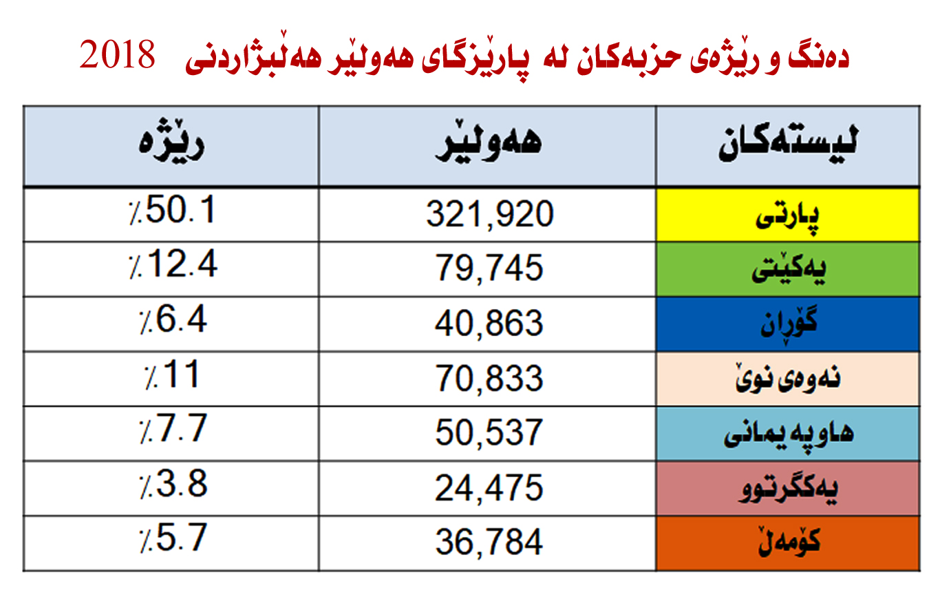 پارێزگای هەولێر لە هەڵبژاردنی ئەنجومەنی نوێنەرانی عێراق 12/5/2018، كە (642232) هاوڵاتی دەنگیانداوە، پارتی دیموكراتی كوردستان توانی (321920) دەنگ بەدەست بهێنێت ، یەكێتی نیشتیمانی كوردستان (79745) دەنگی بەدەستهێناوە لیستی نەوەی نوێ ( 70833) دەنگ بەدەست بهێنێت و هاوپەیمانی ( 50537 ) دەنگی بەدەستهێناوە، لیستی گۆڕان توانی (40863) دەنگ بەدەستبهێنێت ،لیستی كۆمەڵی ئیسلامیی (36784) دەنگ و لیستی یەكگرتووی ئیسلامیی (24475) دەنگ بەدەست بهێنێت، ئەگەرچی بەشێك لە هێزەكان پێیان وایە" ساختەكاری كراوەو دەنگەكان گۆڕاوە"