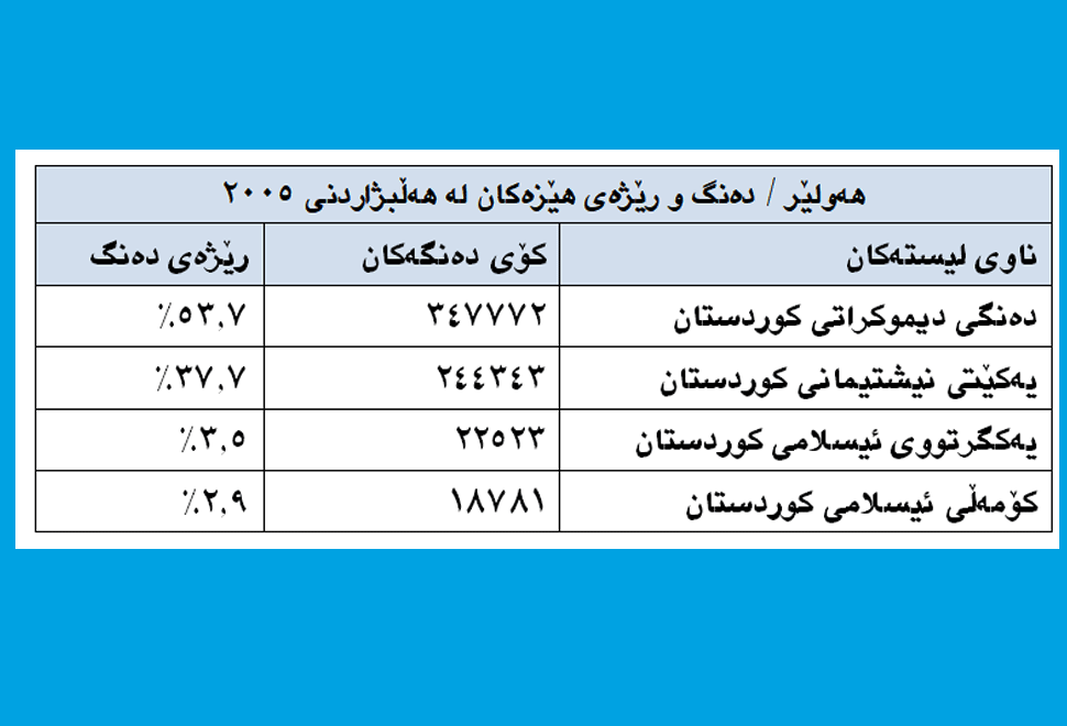 لە هەڵبژاردنی 2005 دا بۆ ئەنجومەنی نوێنەرانی عێراق پارتی و یەكێتی بەیەك لیست بەشداری هەڵبژاردنیان كرد، بەڵام لە هەڵبژاردنی ئەنجومەنی پارێزگاكاندا بە لیستی جیابوو بۆیە ئاستی دەنگی حیزبەكان لەو هەڵبژاردنەدا دەردەكەوێت.