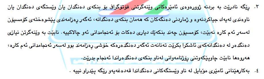 هەروەها لە بڕگەیەكی تری پەیڕەوەكەدا هاتووە كە بەكارهێنانی ئامێری مۆبایل لە ناو وێستگەكانی دەنگداندا قەدەغەیە و رێگەپێدراو نییە.