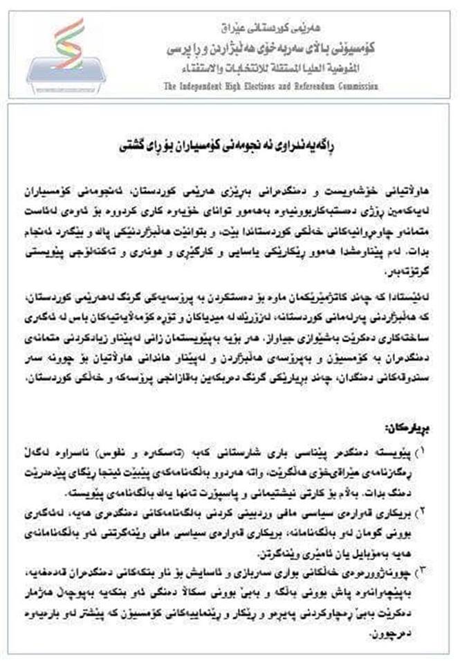 هەندێك پێیان وایە دەبێت بە دوو لەسەر سێی دەنگی ئەندامانی ئەنجومەنی كۆمسیۆن ئەنجامەكان پەسەندبكرێن، ئەمەش بە پشتبەستن بە راگەیەندراوی ئەنجومەنی كۆمسیاران لە رۆژی 29/9/2018 كە لە بڕگەی پێنجەمیدا دەڵێ" پەسەندكردنی ئەنجامەكانی هەڵبژاردنی پەرلەمانی كوردستان بە دەنگی دوو لەسەر سێی ئەندامانی ئەنجومەنی كۆمسیاران دەبێت"، واتا بە دەنگی (6) ئەندام لە كۆی (9) ئەندامەكەی ئەنجومەنی كۆمسیاران.