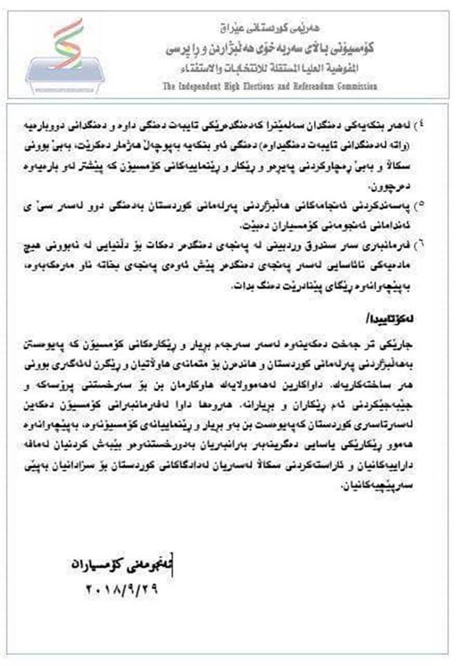 ئەنجومەنی كۆمسیارانی كۆمسیۆنی هەڵبژاردن و راپرسیی هەرێم لە راگەیەندراوێكدا رۆژی 29/9/2018 چەند بڕیارێكەی دەربارەی ئەنجامەكانی هەڵبژاردن دەركرد.