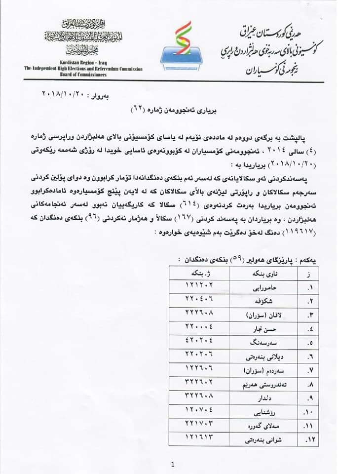 ئەمرۆ تانەمان دا لە بریاری ئەنجومەنی كۆمسیۆنی باڵای سەربەخۆی هەڵبژاردن و راپرسی ژمارە (٦٣ لـــە ٢٠/١٠/٢٠١٨).