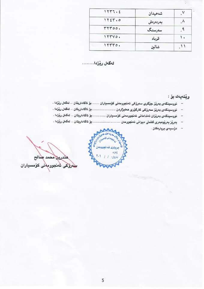 ٢- ئاراستەكردنی نوسراو بۆ فەرمانگەی تانەلێدراو بەمەبەستی داواكردنی بەرایەكانی دەنگی پوچەڵككراوە كە ژمارەی (١١٦٣٨٣) دەنگە و رێژەكەی (٦.٣%) كۆی رێژەی بەشداربووانی هەڵبژرادنی خولی پێنجەمی پەرلەمانی كوردستانە.