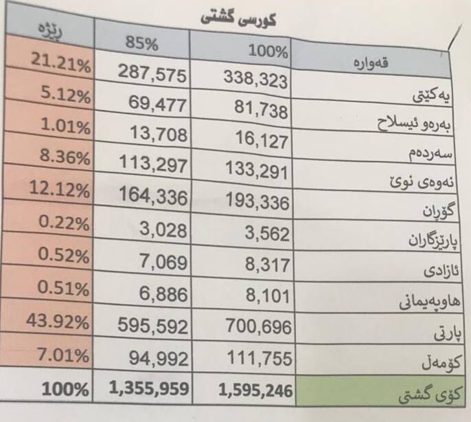 واتە (٧٨١٣١) حەفتاو هەشت هەزارو سەدو سی و یەك دەنگ جیاوازی هەیە لە نێوان دوو راگەیەندراوی فەرمی كۆمسیۆن بە رێژەی (٨٥%) بۆ ئەنجامی بەرایی و كۆتایی، كە زیاترە لە (٥) كورسی پەرلەمانی كوردستان.