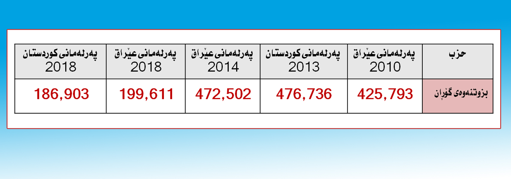 لە هەڵبژاردنی 2010 ی پەرلەمانی عێراق بزوتنەوەی گۆڕان لە سێ پارێزگاكەی هەرێمی كوردستان (425,793) دەنگی بەدەستهێنا لەگەڵ 8 كورسی پەرلەمانی عێراق، بەڵام لە هەڵبژاردنی 2014 ی پەرلەمانی عێراق (472,502) دەنگی بەدەستهێنا و كورسیەكانیشی زیادیكرد بۆ 9 كورسی پەرلەمانی عێراق، لەگەڵ ئەوەی دەنگەكانی زیاتر لە ( 47 هەزار ) دەنگ زیادیكرد بەرێژەی ( 10%)، ئەگەر بەراوردی بكەین بە هەڵبژاردنی پەرلەمانی عێراق 12ی ئایاری 2018 كە گۆڕان لە سێ پارێزگاكەی هەرێم (199,611) دەنگی بەدەستهێنا لەگەڵ 5 كورسی پەرلەمان، واتا لە نێوان هەڵبژاردنی 2010 بۆ 2018 گۆڕان دەنگەكانی (226,182) بەرێژەی ( 53%) كەمیكردووە .