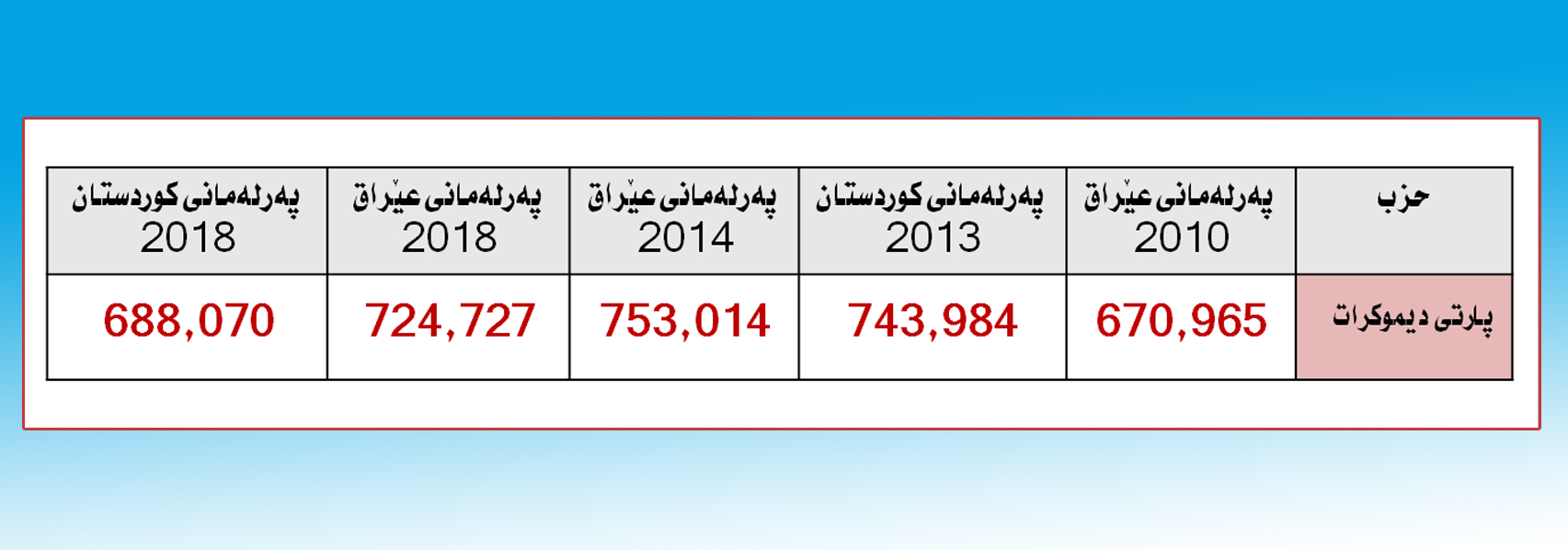 لە هەڵبژاردنی 2010 ی پەرلەمانی عێراق پارتی دیموكراتی كوردستان لە سێ پارێزگاكەی هەرێمی كوردستان (670,965) دەنگی بەدەستهێنا ، بەڵام لە هەڵبژاردنی 2014 ی پەرلەمانی عێراق (753,014) دەنگی بەدەستهێنا ، دەنگەكانی زیاتر لە ( 82 هەزار ) دەنگ زیادیكرد بەرێژەی ( 12%)، ئەگەر بەراوردی بكەین بە هەڵبژاردنی پەرلەمانی عێراق 12ی ئایاری 2018 كە پارتی لە سێ پارێزگاكەی هەرێم (724,727) دەنگی بەدەستهێنا لەگەڵ 25 كورسی پەرلەمان، واتا لە نێوان هەڵبژاردنی 2010 بۆ 2018 پارتی دەنگەكانی (53762) بەرێژەی ( 8%) زیادیكردووە.