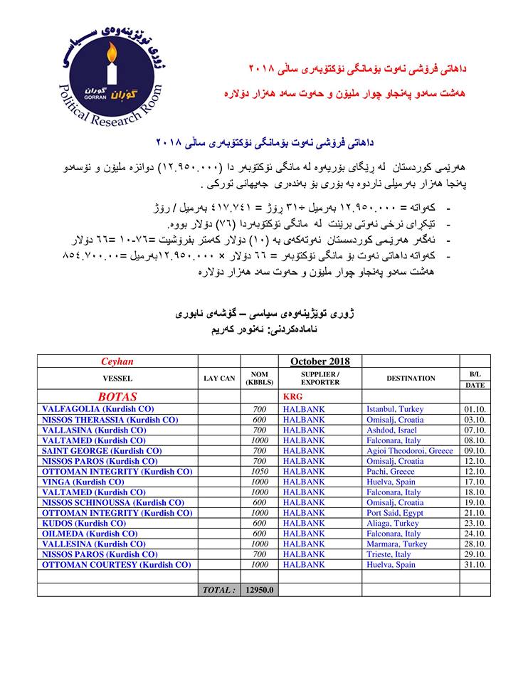 بەپێی راگەیەنراوێكی (گۆشەی ئابوری ژوری توێژینەوەی بزوتنەوەی گۆڕان) كە ئەنوەر كەریم ئامادەی كردووە  لە مانگی ئۆكتۆبەردا هەرێمی كوردستان هەرێمی كوردستان  لە ڕێگای بۆریەوە (12.950.000) دوانزە ملیۆن و نۆسەدو پەنجا هەزار بەرمیلی ناردوە بە بۆری بۆ بەندەری  جەیهانی توركی كە رۆژانە دەكاتە (417.741  ) 417 هەزار و 741 بەرمیل.