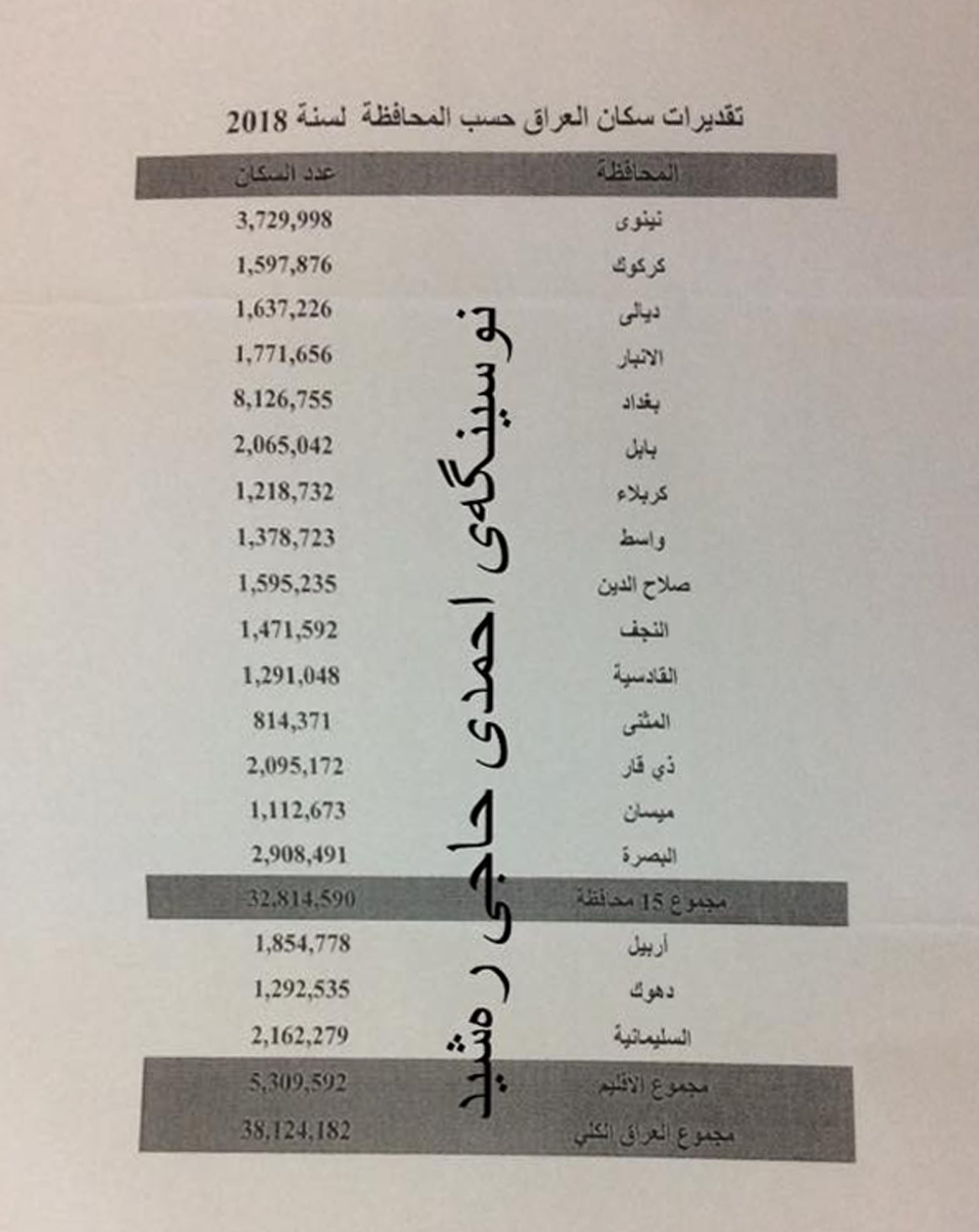 - دانیشتوانی عێراق بۆ ساڵی 2018 (۳۸۱۲٤۱۸۲) سی و هەشت ملێۆن و سەدو بیست وچوار هەزارو سەدو هەشتاو دوو كەسە،