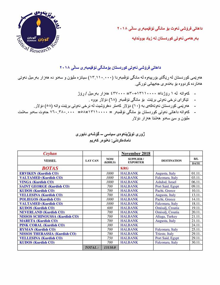 بەپێی راپۆرتەكە لە مانگی تشرینی دووەمی 2018 هەرێمی كوردستان لە ڕێگای بۆرییەوە 13 ملیۆن و110 هەزار بەرمیل نەوتی هەناردە كردووە بۆ بەندەری جەیهانی توركی، واتا لەە یەك رۆژدا ( 13110000÷30= 437000 هەزار بەرمیلی رۆژانە.