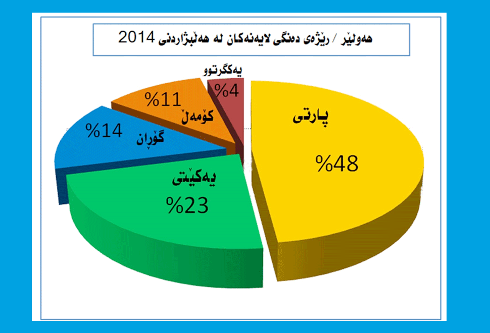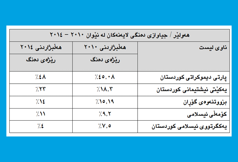 بەڵام پارێزگای هەولێر لە هەڵبژاردنی ئەنجومەنی نوێنەرانی عێراق 30/4/2014، كە (936557) هاوڵاتی مافی دەنگدانیان هەبووە و (744489) هاوڵاتیش دەنگیانداوە، پارتی دیموكراتی كوردستان توانی (354735) دەنگ بەدەست بهێنێت بەرێژەی (48% ) و ، یەكێتی نیشتیمانی كوردستان (168688) دەنگی بەدەستهێناوە بەڕێژەی (23%) و لیستی گۆڕان توانی (104059) دەنگ بەدەستبهێنێت بەڕێژەی (14%) و لیستی كۆمەڵی ئیسلامیی (80492) دەنگ بەڕێژەی (11%) و لیستی یەكگرتووی ئیسلامیی (26323) دەنگ و بەڕێژەی (4%)ی دەنگەكان بەدەست بهێنێت، بەڵام لەم هەڵبژاردنەدا رێژەی دەنگی لایەنەكان زیاتر بوو لە پارتی كە پارتی 45% و لایەنەكانی تریش زیاتر لە 50%ی دەنگەكانیان مسۆگەر كردووە.
