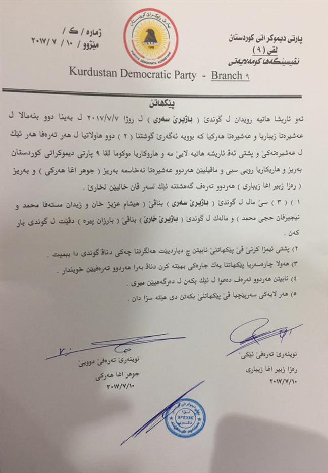 رێككەوتنی پێشوو، كە ئێستا لەنێوان هەردوو عەشیرەتەكەدا شكێندراوەو كاری پێناكرێت، لە لقی پارتی ئیمزا كراو یەكێك لە خاڵەكانی ئەوە بوو" نابێت هەردوو لایەن پەناببنەبەر دادگاو سكاڵا لەسەر یەكتر تۆمار بكەن".