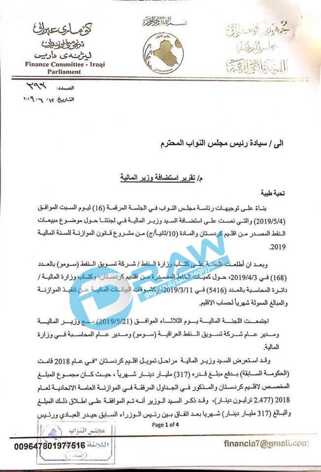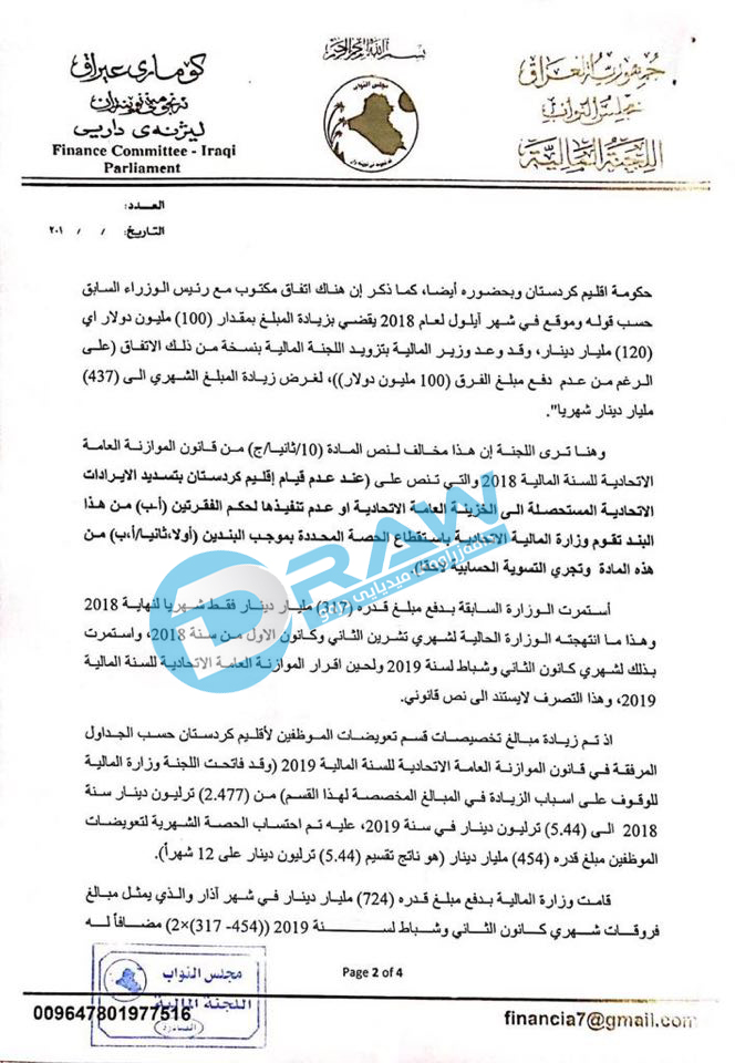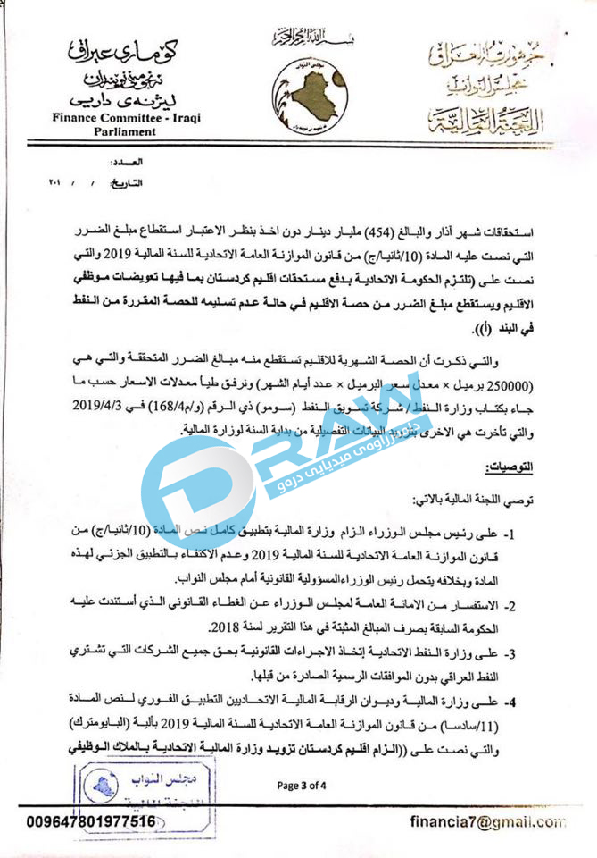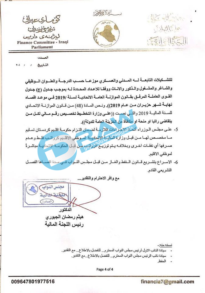 لیژنەی دارایی پەرلەمانی عێراق دوای میوانداریكردنی فوئاد حسێن، وەزیری دارایی لە راپۆرتی خۆیدا بۆ سەرۆكی پەرلەمان، داوا دەكات ئەنجومەنی وەزیرانی عێراق رێوشوێنی پێویست بگرێتەبەر بۆئەوەی ئەو بودجەیەی لە بەغداوە رەوانەی هەرێم دەكرێت، بگاتە دەستی موچەخۆرانی هەرێمو بۆ هیچ خەرجییەكی تر تەرخان نەكرێت، ئەگەر ئەوەش رویدا حكومەتی فیدراڵی خۆی راستەخۆ موچەی فەرمانبەرانی هەرێم دابەشبكات.