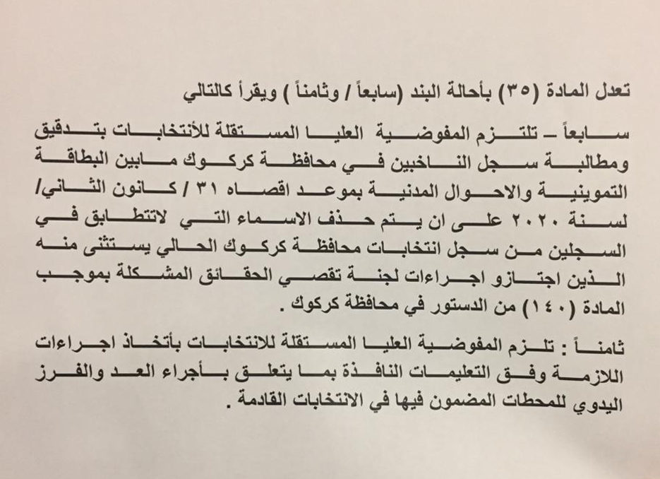 بەپێی هەمواری بڕگەی ( 7 ، 8 ) مادەی 35ی یاسای هەڵبژاردنی ئەنجومەنی پارێزگاكان كە تایبەتە بە هەڵبژاردن لە پارێزگای كەركوك كۆمسیۆنی هەڵبژردنەكانی عێراق پابەندكراوە كە تاوەكو( 31ی كانونی دوەمی 2020 )وردبینی بكات لە تۆماری دەنگدەراندا، لەگەڵ ژماردنەوەی دەستی دەنگەكان لەو وێستگانەی كە داوای ژماردنەوەی دەستی دەنگەكانی دەكرێت.