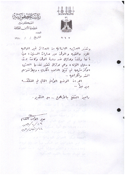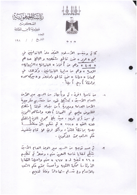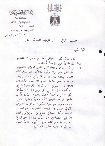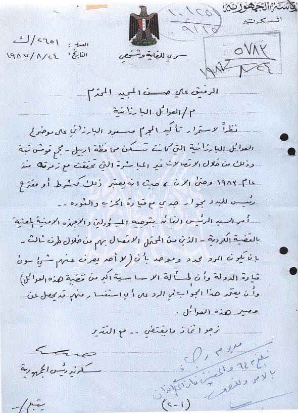 بەپێی بەڵگەنامەیەك سكرتاریەتی سەرۆك كۆمار بە نووسراوی 2651/ك لە 24/8/1987 دا فەرمانی دەركردووە بۆ هەموو ئەو دام و دەزگا و بەرپرسانەی تایبەتن بە كێشەی كورد لەوانەیە لە لایەنێكی سێهەهەمەوە پەیوەندییان پێوە بكرێت و سەبارەت بە چارەنووسی بارزانییەكان و پرسیارییان لێ بكرێت، بۆیە وا پێویست ئەكات كە وەڵام دانەوەی هەر پرسیارێك سەبارەت بەم بابەتە ئەم وەڵامە بێت كە: "تەنها سەرۆكایەتی دەوڵەت لەم كێشەیە ئاگادارە چونكە كێشەكە كێشەیەكی سیاسیە و زۆر گەورەترە لە كێشەی ئەم خێزانانە".