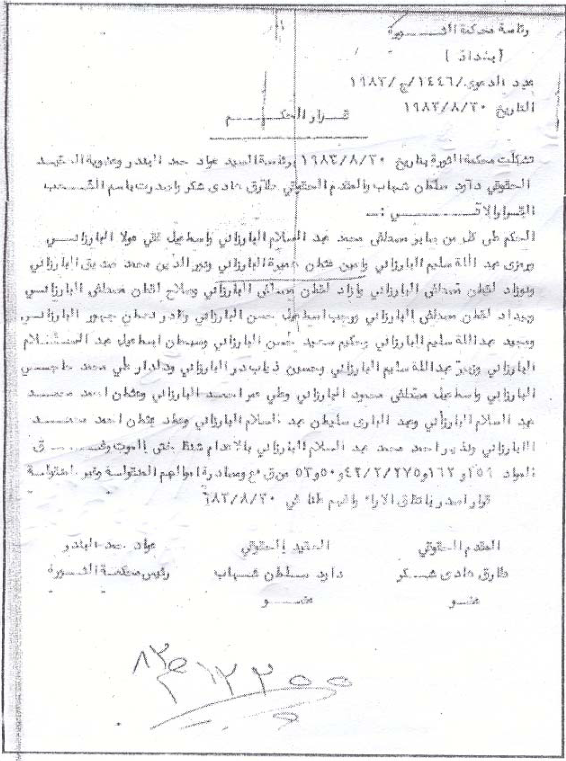 بڕیاری لە سێدارەدانی كوڕەكانی مەلا مستەفا لە دادگای شۆرش بەسەرۆكایەتی عەواد حەمەد بەندەر دەركرا: حوكمی لە سێدارەدان درا بەسەر ھەر یەك لە (سابیر مستەفا محەمەد عەبدولسەلام بارزانی و نەوزاد لوقمان مستەفا بارزانی و ئازاد لوقمان مستەفا بارزانی و سەلاح لوقمان مستەفا بارزانی و بیداد لوقمان مستەفا بارزانی و ئیسماعیل فەقی عەولا بارزانی و ئەمین عوسمان ھەمیرە بارزانی و نورەدین محەمەد سدیق بارزانی و رەجەب ئیسماعیل حەسەن بارزانی و قادر نوعمان جەھوەر بارزانی و مەجید عەبدوڵا سەلیم بارزانی و حەكیم سەعید حەسەن بارزانی و سوبحان ئیسماعیل عەبدولسەلام بارزانی و زوبیر عەبدوڵا سەلیم بارزانی و حسێن زیاب بارزانی و دڵدار عەلی محەمەد حاجی بارزانی و ئیسماعیل مستەفا محەمەد بارزانی و عەلی عومەر ئەحمەد بارزانی و عوسمان ئەحمەد محەمەد بارزانی و عەبدولباری سلێمان عەبدولسەلام بارزانی و عیماد عوسمان ئەحمەد محەمەد بارزانی و نەزیر ئەحمەد محەمەد عەبدولسەلام بارزانی)، بەلام ھەر یەك لە لوقمان و عوبەیدوڵا بە بریارێكی تر لە سێدارەداران چونكە ئەوان وەزیر و پارلەمانتار بوون.
