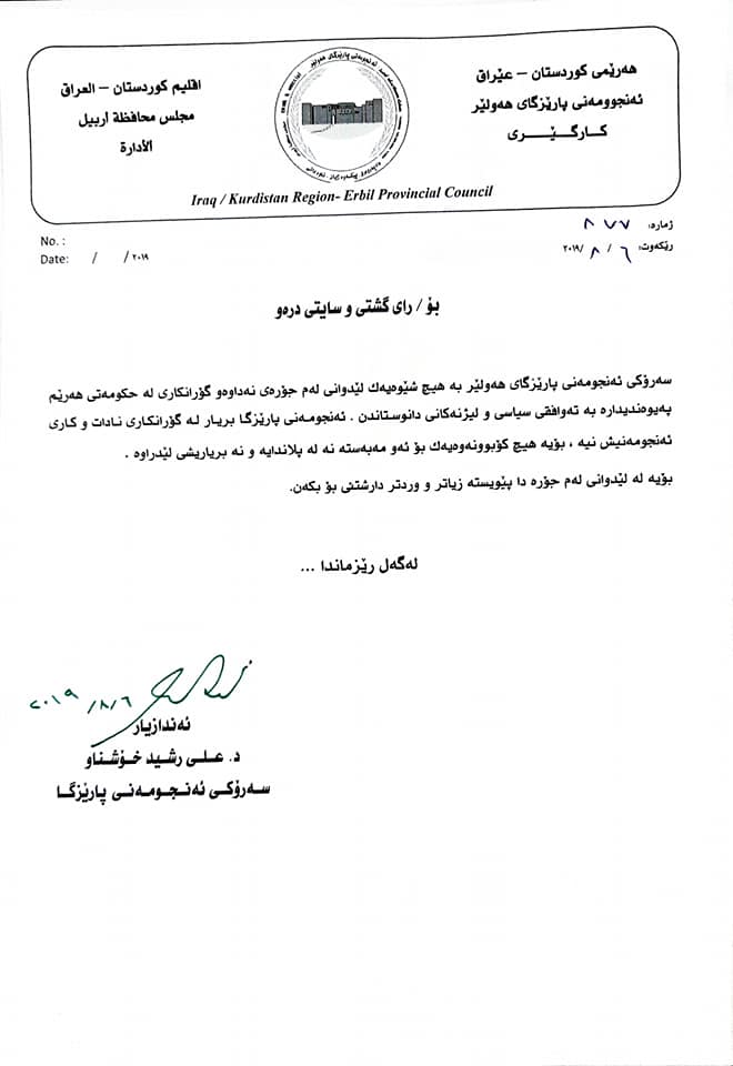 عەلی رەشید سەرۆكی ئەنجومەنی پارێزگای هەولێر رونكردنەوەیەكی بڵاوكردەوەو تێیدا كرۆكی هەواڵێك رەتدەكاتەوە لە پەیجی فەرمی (درەو میدیا) بڵاوبوەتەوە.