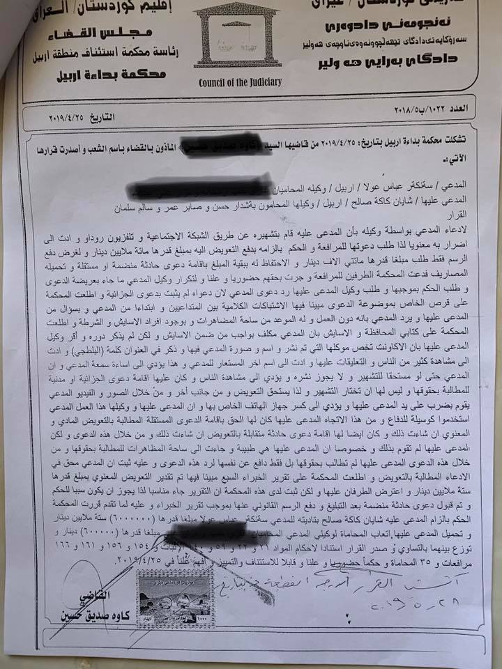 شایان عەسكەری كە ئێستا پەرلەمانتاری بزوتنەوەی گۆڕانە لەپەرلەمانی كوردستان، لە پەیجی تایبەتی خۆی لە تۆڕی كۆمەڵایەتی فەیس بووك بڕیارەكانی دادگای بڵاوكردۆتەوەو ئاماژەی بەوەكردووە" ئەمڕۆ بڕیاری دادگام بەدەست گەیشت كە من دەبێ بڕی ١١ ملیۆن دیناری عیراقی بدەم بەوانەی سكاڵایان لێ كردبووم و بڕی ٢ ملیۆن دیناری عیراقیش بۆ پارێزەرەكانیان، واتە بە ھەمووی دەبێ ١٣ ملیۆن دیناری عیراقی ڕادەست كەم"