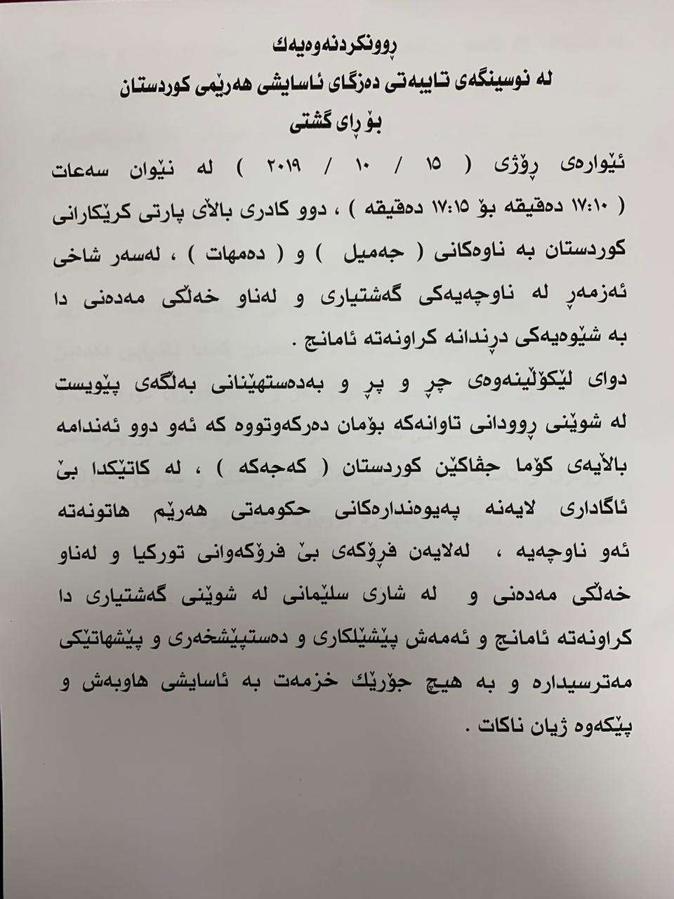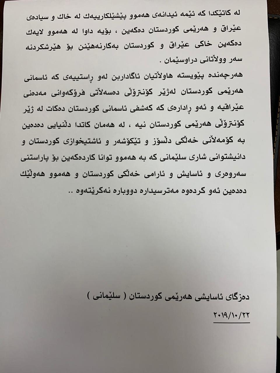 دەزگای ئاسایی بێ ئاگایی خۆی نیشان دەدات لە هاتنی ئەو دوو ئەندامەی كۆما جڤاكێن كوردستان "دوای لێكۆڵینەوەی چڕ و پڕ و بەدەستهێنانی بەڵگەی پێویست لە شوێنی روودانی تاوانەكە بۆمان دەركەوتووە كە ئەو دوو ئەندامە باڵایەی كۆما جڤاكێن كوردستان (كەجەكە). لە كاتێكدا بەبێ ئاگاداری لایەنە پەیوەندیدارەكانی حكومەتی هەرێمی كوردستان هاتوونەتە ئەو ناوچەیە، لەلایەن فڕۆكەی بێ فڕۆكەوانی توركیا و لەناو خەڵكی مەدەنی و لە شاری سلێمانی لە شوێنی گەشتیاریدا كراونەتە ئامانج و ئەمەش پێشێلكاری و دەستپێشخەری و پێشهاتێكی مەترسیدار "