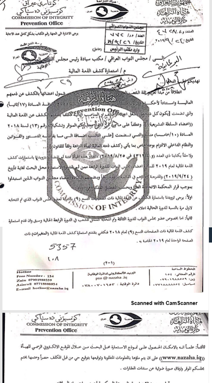 بە نوسراوێكی رەسمی دەستەی نەزاهەی عێراق ئەنجومەنی نوێنەران ئاگادار دەكاتەوە كە ئەو پەرلەمانتارانەی ناویان لەخوارەوە هاتووەو فۆرمی ( ئاشكراكردنی سەروەت و سامانیان ) پڕنەكردۆتەوە داوا دەكات سامانەكەیان ئاشكرا بكەن.