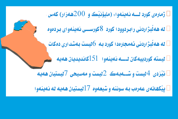 رۆژی 12ی ئایار خولی چوارەمی هەڵبژاردنی ئەنجومەنی نوێنەران لە عێراق بەڕێوەدەچێت، كورد وەكو پێكهاتەیەكی سەرەكی پارێزگای نەینەوا دابەشبووە بەسەر (6) لیستی جیاوازدا، بەهۆی پەرتبون و ئەو شكستانەی بەمدواییانە رویدا، دەنگەكانی كورد لەو پارێزگایە لەبەردەم هەڕەشەدایە.