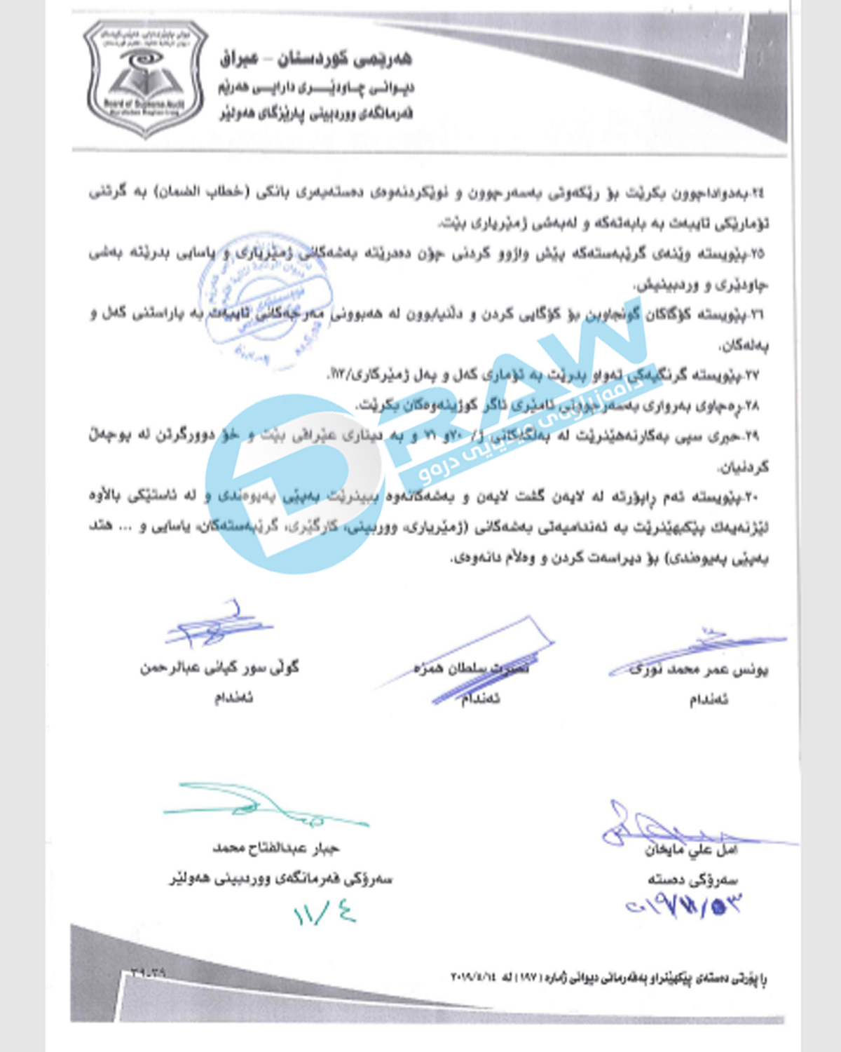 • دەردەكەوێت رەسمی پولی دارایی دوای ئەنجامدانی گرێبەستەكە وەرگیراوە، پولی دارایی بە بڕی (196 هەزار) دینار دانراوە.