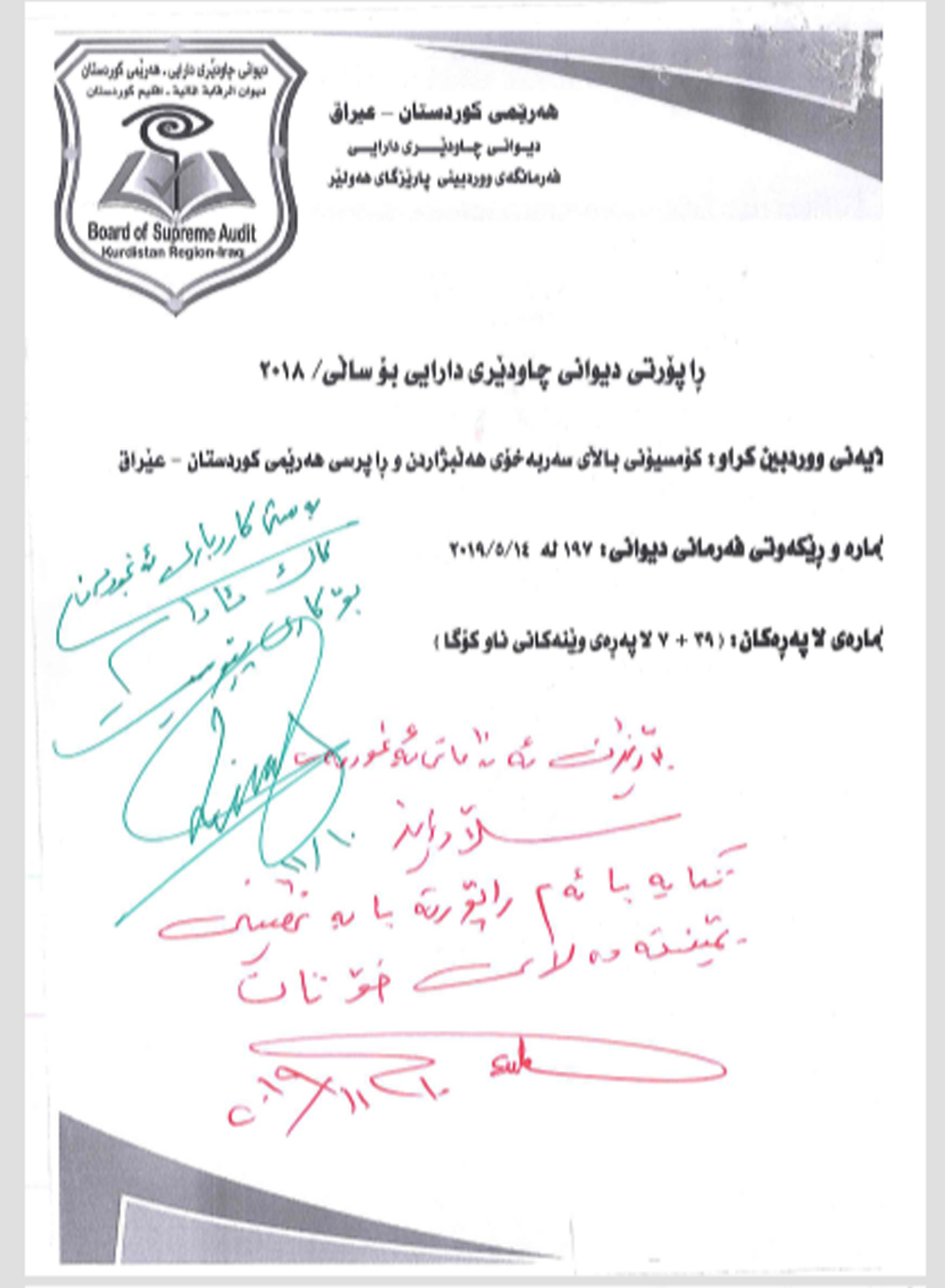 راپۆرتی دیوانی چاودێری دارایی باس لە بەڵگەنامەیەكی خەرجكردن دەكات كە مێژووەكەی دەگەڕێتەوە بۆ (4/12/2018)، ئەم پسوڵەیە تایبەتە بە چاپكردنی فۆرمی دەنگدان.