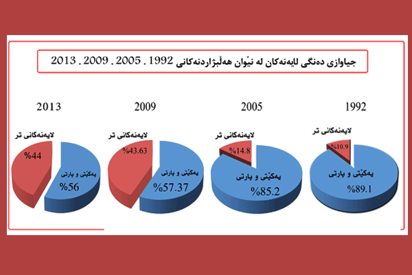 لە هەرێمی كوردستان سەرەرای سێ هەڵبژاردنی پەرلەمانی عێراق و دوهەڵبژاردنی پارێزگاكان، چوار هەڵبژاردنی پەرلەمانی كوردستان كراوە ( 1992 ، 2005 ، 2009 ، 2013 )، لێرەدا بەووردی ئاستی دەنگ و كورسی هێزە سیاسیەكان دەخەینە روو لەو چوار هەڵبژاردنەی پەرلەمانی كوردستاندا، كە لەماوەی 21 ساڵەدا چی گۆڕانكاریەك بەسەر دەنگ و كورسی ئەو هێزانەدا هاتووە، لە هەڵبژاردنی 1992 دا كە ( 1 ملیۆن و 112 هەزار ) كەس مافی دەنگدانی هەبوو ( 971 هەزارو 953 ) كەس دەنگیاندا بەرێژەی ( 87.4% )، هەرچەندە (لە هەڵبژاردنی 1992 لە پارێزگای دهۆك 178 هەزار كەس مافی دەنگدانی هەبوو 198 هەزار كەس دەنگیدا واتا رێژەكە 111% بوو ) بەڵام بەهۆی دیاریكردنی رێژەی 7% بۆ چونە پەرلەمان ئەویش بەپێی بڕگەی 3 لەمادەی 36ی یاسای ئەنجومەنی نیشتیمانی كوردستان، 7 لیست بەشداریان تێدا كردوو تەنها لێستی یەكێتی و لیستی پارتی ئەو رێژەیەیان تێپەراندوو چونە پەرلەمانەوەو دواتر دەنگەكانی ئەو لیستانەشیان بەسەر خۆیاندا دابەشكرد كە رێژەی 7% یان نەهێنابوو لە هەڵبژاردنی 1992 دا لیستی پارتی دیموكراتی كوردستان ( 438339) بەدەستهێنابوو بەرێژەی (44.517% ) و لیستی یەكێتی (423682 ) بەرێژەی ( 44.033% ) بەڵام ئەو لیستانەی نەچونە پەرلەمانەوە لیستی بزووتنەوەی ئیسلامی (49073 ) دەنگی بەدەستهێنا بەرێژەی (5.100% ) و كە زۆرترین دەنگی دوای لیستی یەكێتی و پارتی هێناو نەچووە پەرلەمانەوە دواتریش لیستی سۆسیالیست (24867 ) دەنگ بەرێژەی( 2.584% ) بەدەستهێناو لیستی پارتی گەل (21106 ) بەرێژەی ( 2.193% )، لیستی حیزبی شیوعی( 9902 ) بەرێژەی (1.029% ) بەدەستهێناو لیستی دیموكراتخواز و بێلایەنەكانیش (500 ) بەرێژەی (0.519% ) بەدەستهێنا كۆی گشتی دەنگی ئەو لیستانەی كە نەچونە پەرلەمانەوە ( 105517 ) دەنگ بوو كە بەهۆی یاسای هەڵبژاردنەوە فەوتان و خرانە سەر دەنگی یەكێتی و پارتی.