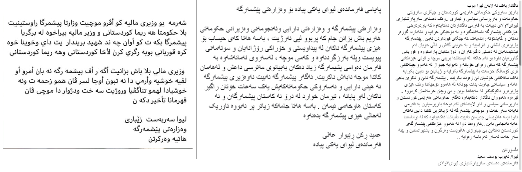 لەلایەن خۆشیەوە لیوا (ئەیوب یوسف سەعید)، فەرماندەی دەستەی سەرپەرشتیاری لیوای3و7ی هێزەكانی پێشمەرگە كە بە لیواكانی كۆسرەت رەسوڵ ناسراوە، لە پەیجی تایبەتی خۆی لە تۆڕی كۆمەڵایەتی فەیس بووك رەخنەی توندی لە دواكەوتنی موچەی پێشمەرگە گرتوو رایگەیاند: