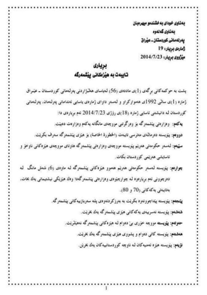 دووەم: پێدانی موچەی پێشمەرگەی لەپلەی یەكەم دەرهێناوە كە بڕیاری پەرلەمانی كوردستانە
