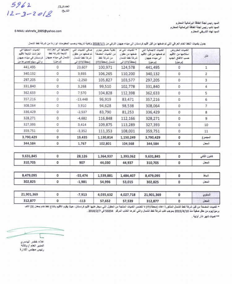 بەپێی زانیارییەكانی كۆمپانیای بەبازاڕكردنی نەوتی عێراق " سۆمۆ"، لە مانگی یەكی 2018 حكومەتی هەرێمی كوردستان بڕی ( 9631845 ) نەوتی فرۆشتووە رۆژانە دەكاتە( 344584 ) بەرمیل نەوت، نرخی بەرمیلێك نەوت ئێستا لە بازاڕەكانی جیهان 65 دۆلارە و ئەگەر لە بەرمیلێك 55 دۆلاریشی بمێنێتەوە ئەوا دەكاتە (529751475 ) دۆلار واتا نزیكەی ( 530 ملیۆن دۆلار) كە دەكاتە ( 636 ملیار ) دیناری عێراقی.