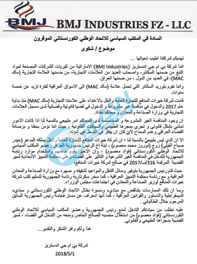 ئەو كۆمپانیا ئیماراتییە لە نامەیەكی رەسمیدا سكاڵای خۆی لەو پرسەدا گەیاندووەتە مەكتەبی سیاسیی یەكێتی نیشتمانی كوردستان و داوادەكات كاربكەن بۆئەوەی دەستوەردانی فوئاد مەعسوم لە بەرژەوەندی كۆمپانیای برازاكەی رابگرن لە دادگاكانی عێراقدا.