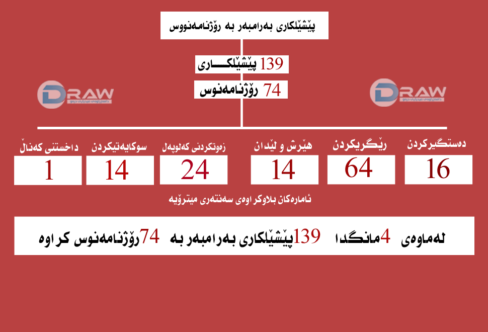 سەنتەری میترۆ بۆ داكۆكی لە مافی رۆژنامەنوسان، لە رۆژی جیهانی ئازادی رۆژنامەنوسی رایدەگەیەنێت لە سەرەتای ساڵی 2018 تا كۆتایی نیسانی ئەمساڵ 139 پێشێلكاری بەرامبەر بە 74 رۆژنامەنوس و ئەنجامدراوە، بەم شێوەیە: