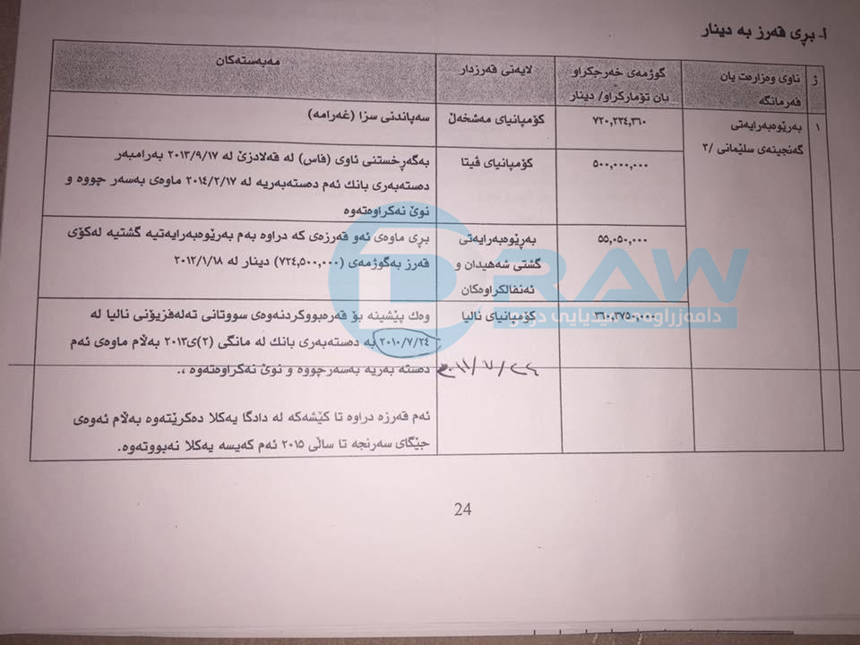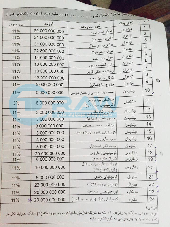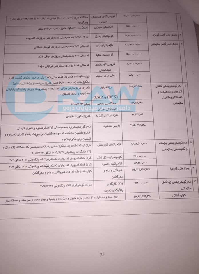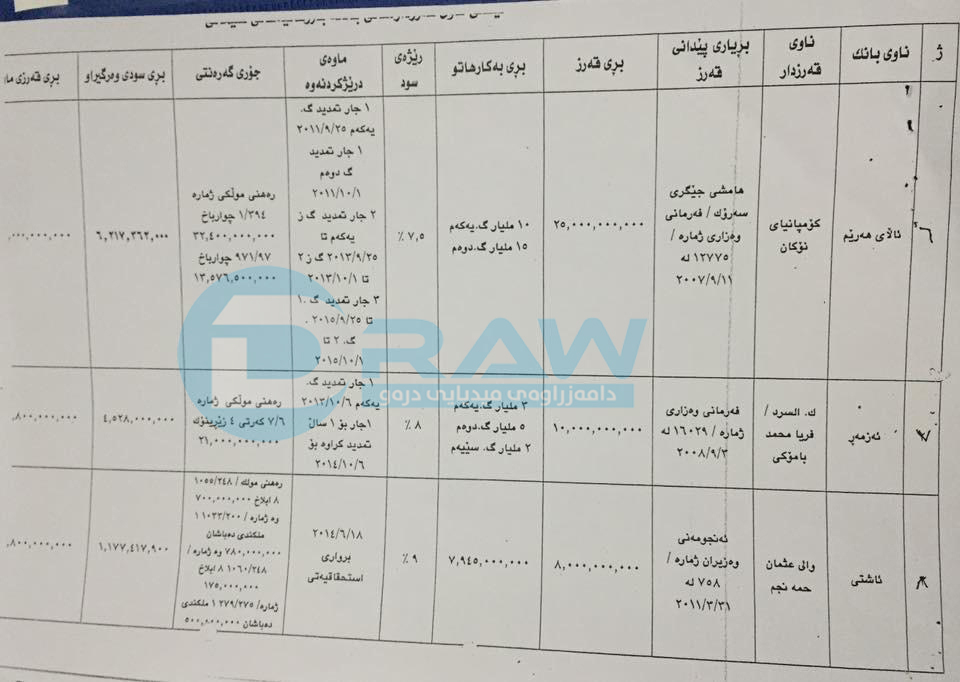 • (درەو) لیستی ناوەی قەرزوەرگرەكانی لایە، بەڵام بەهۆی زۆری ناوەكانەوە هەموو لێرەدا بڵاوناكاتەوەو لە كۆتایی ئەم راپۆرتەدا وێنەی لیستی ئەو كەسو كۆمپانیایانە بڵاودەكەینەوە كە قەرزەكانیان وەرگرتووە.