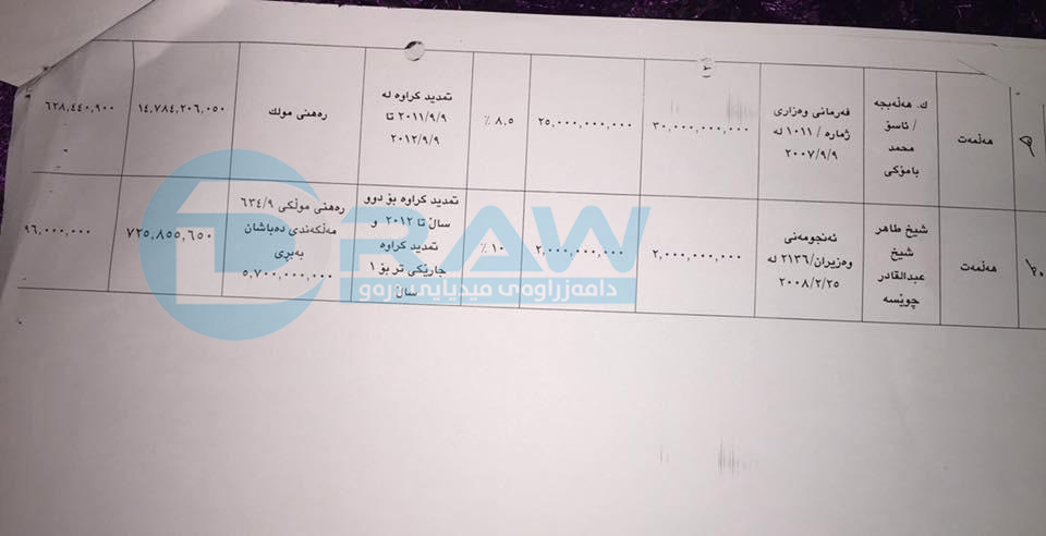 • شێخ تاهیر شێخ عەبدولقادر چوێسە، ئەم پیاوە بەگوژمەی (2 ملیار) دینار سودمەندبووە لە قەرزەكە، رەهنی وەرگرتنی قەرزەكە موڵكی مەڵكەندی- دەباشان-ە، سودی قەرزەكە 10%ە.