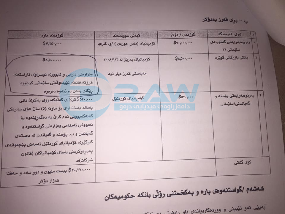 • كۆمپانیای دیار، بە گوژمەی (20 ملیار) دینار سودمەندبووە لە قەرزەكە، سودی قەرزەكە 11%ە.