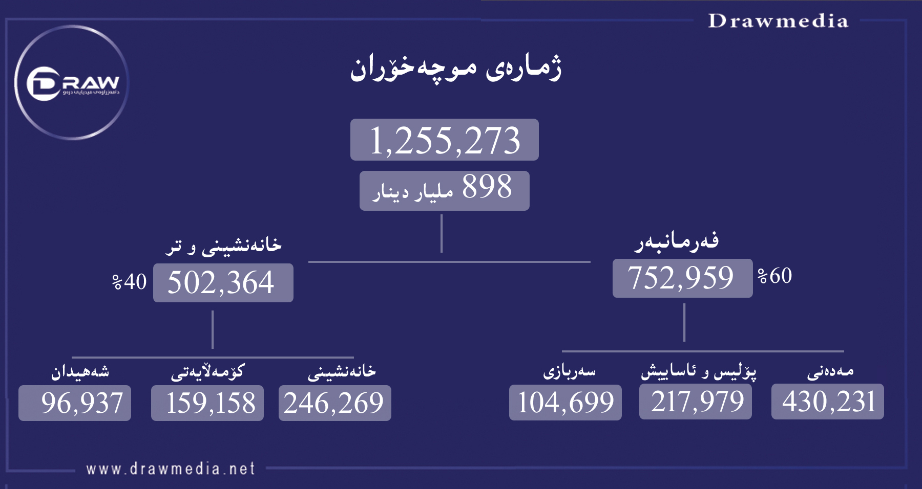 ژمارەی راستەقینەی موچەخۆرانی هەرێمی كوردستان ( ملیۆنێك و 255 هەزارو 273) كەسە، موچەی مانگەیان (898 ملیار)موچەی مانگانەیانە، ئەو ژمارەیە دابەش بووە بەسەر دوو بەشدا: