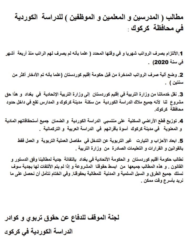بەغداد كە ئامادە نەبوو دوای شەڕی لەناوبردنی رێكخراوی "داعش" ئیدارەی كەركوك بەتەواوەتی رادەستی كورد بكاتو بەشەڕ گەڕایەوە بۆ كۆنترۆڵكردنەوەی ناوچەكە، ئێستا ئامادە نییە بەبێ مەرج راژەی مامۆستاو فەرمانبەرانی خوێندنی كوردی بخاتەسەر خۆی، ئەمە لەكاتێكدایە خوێندنی توركمانو كلدۆئاشوری لە ئەستۆگرتووە، بەپێی قسەی مامۆستا رەئوف سەعدوڵا، بەغداد دوو مەرجی هەیە بۆ ئەوەی راژەی مامۆستاو فەرمانبەرانی خوێندنی كوردی لە ئەستۆ بگرێت: