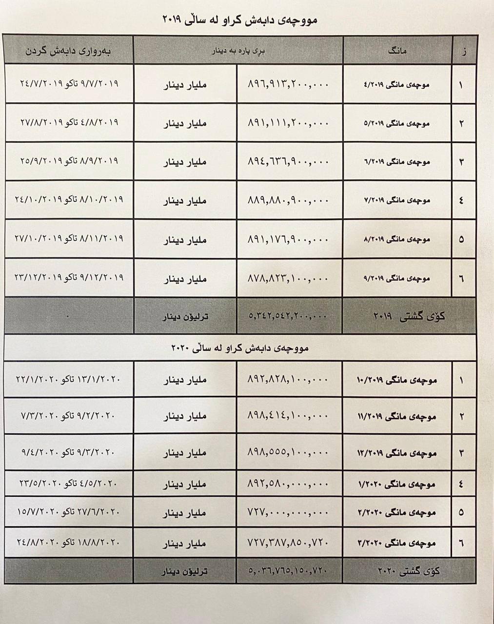 سەرباری ئەوەی لە خشتەكەدا هەڵەیەكی تری تێدایە كە لە مانگی (10) حكومەت دوو موچەی دابەشكردووەو نوسیویەتی موچەی مانگی تەموزی 2019 لە ( 2019/10/8 بۆ 2019/10/24) بۆ مانگی ئاب لە 2019/11/8 بۆ 2019/10/27 ) واتا لە مانگی 10 حكومەت دوو موچەی دابەشكردووە