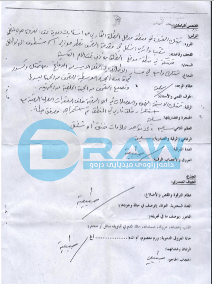 ئهو سهرنجی زیاتری لهسهر ئاسهوارهكانی ئهشكهنجهدان و پێوهنانی فیشهكهكه ههبوو كه له راپۆرتهكهدا بهجۆرێكی تر نووسراوه، بۆ نموونه "سهردهشت فیشهك به دهمییهوه نرابوو كهچی له راپۆرتهكه دهڵێ بهر سهری كهوتووه، له كاتێكدا شوێنی پێوهنانی فیشهكهكه بۆناو دهمی ئاماژهیه بۆ ههڕهشه و سهركوتكاری نووسین و وتن و بۆئهو بابهتانهی كه نووسیونی".
