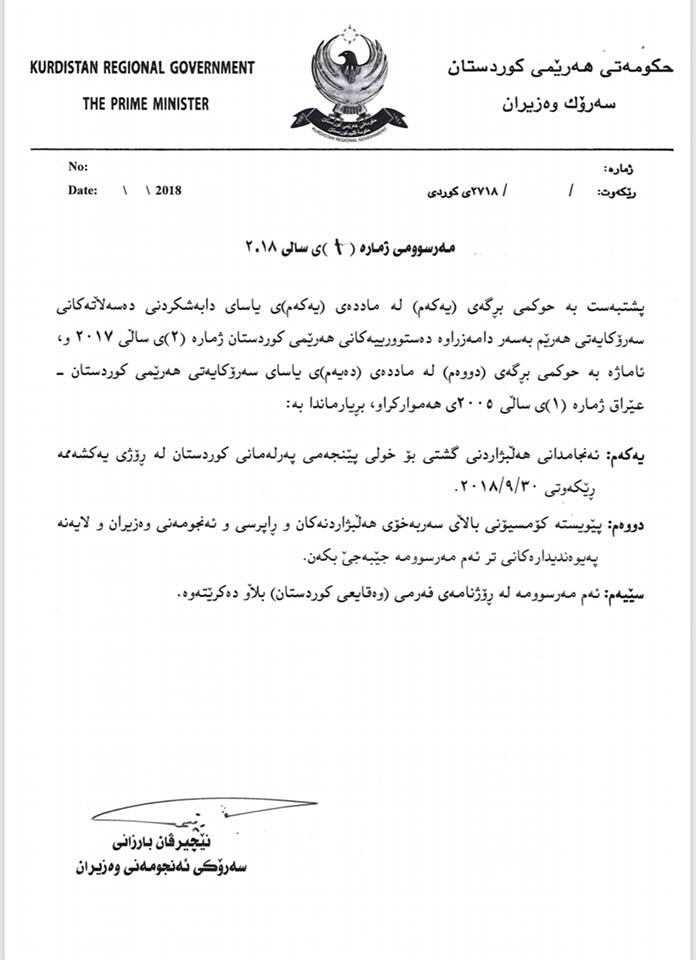 بەپێی مەرسومی ژماریە 1 ی ساڵی 2018ی ئەنجومەنی وەزیرانی حكومەتی هەرێم رۆژی 30/9/2018 دیاریكرا بۆ ئەنجامدانی هەڵبژاردنی گشتی خولی پێنجەمی پەرلەمانی كوردستان ، بڕیارەكە ئاماژەی بەوەشكردووە كە هەڵبژاردنەكە لە لایەن كۆمسیۆنی باڵای سەربەخۆ هەڵبژاردن و راپرسی هەرێمەوە ئەنجامدەدرێت.