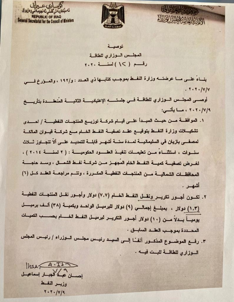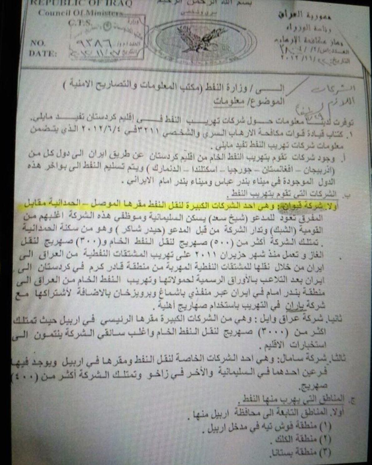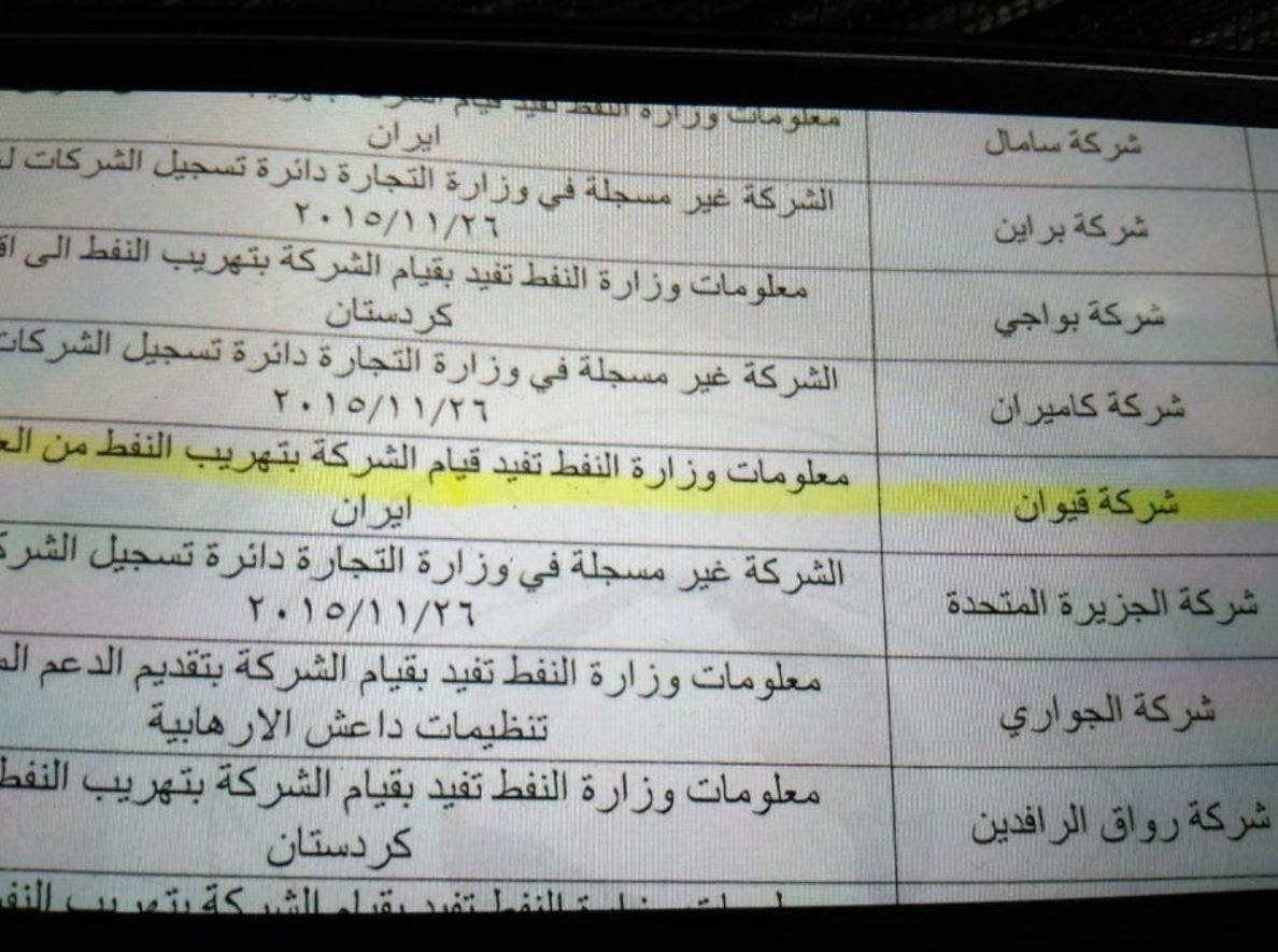 (العربیە) بەڵگەنامەی فەرمی دەستکەوتووە کە ئاشکرایدەکات (٣) کۆمپانیای عێراقی بۆ گواستنەوەی نەوت، کە خاوەندارێتییان بۆ یەک خێزان دەگەڕێتەوەو موڵکی کۆمەڵێک بران، سەرپێچی جێبەجێکردنی گرێبەستە حکومییەکانیان کردووەو گرێبەستەکانی فرۆشتنی بەرهەمە نەوتییەکانیان قۆرخکردووە، ئەمەش بەپێی دانپێدانانی دەستەی نەزاهەی عێراق.