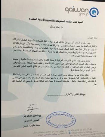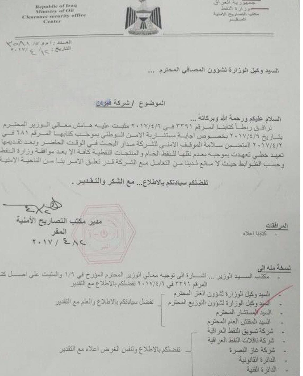 بەڵام (العربیە) بەڵگەنامەی فەرمی دەستکەوتووە "کە بە نهێنی و تایبەت ناوبراوە"و لە وەزارەتی نەوتی عێراق- نوسینگەی زانیاریی و مۆڵەتە ئەمنییەکانەوە لە ١٨ی سێپتێمبەری ٢٠١٦ ئاڕاستەی کۆمپانیای سۆمۆ کراوە، تێیدا داوا کراوە رێوشوێنی یاسایی بگیرێتەبەر لەبەرامبەر کۆمپانیای "قەیوان"و پرسی مامەڵەکردن لەگەڵ کۆمپانیاکە یەکلابکرێتەوەو نوسیویەتی" دەزگای هەواڵگریی نیشتمانیی ئاگاداریکردوین لاری نیە لە مامەڵەکردن لەبارەی کۆمپانیای ناوبراو، تا ئەوکاتەی چاودێری بابەتەکە دەکەن"، ئەمەش بەواتای ئەوەدێت کۆمپانیاکە بەردەوام بووە لەسەر کارە بازرگانییەکانی.