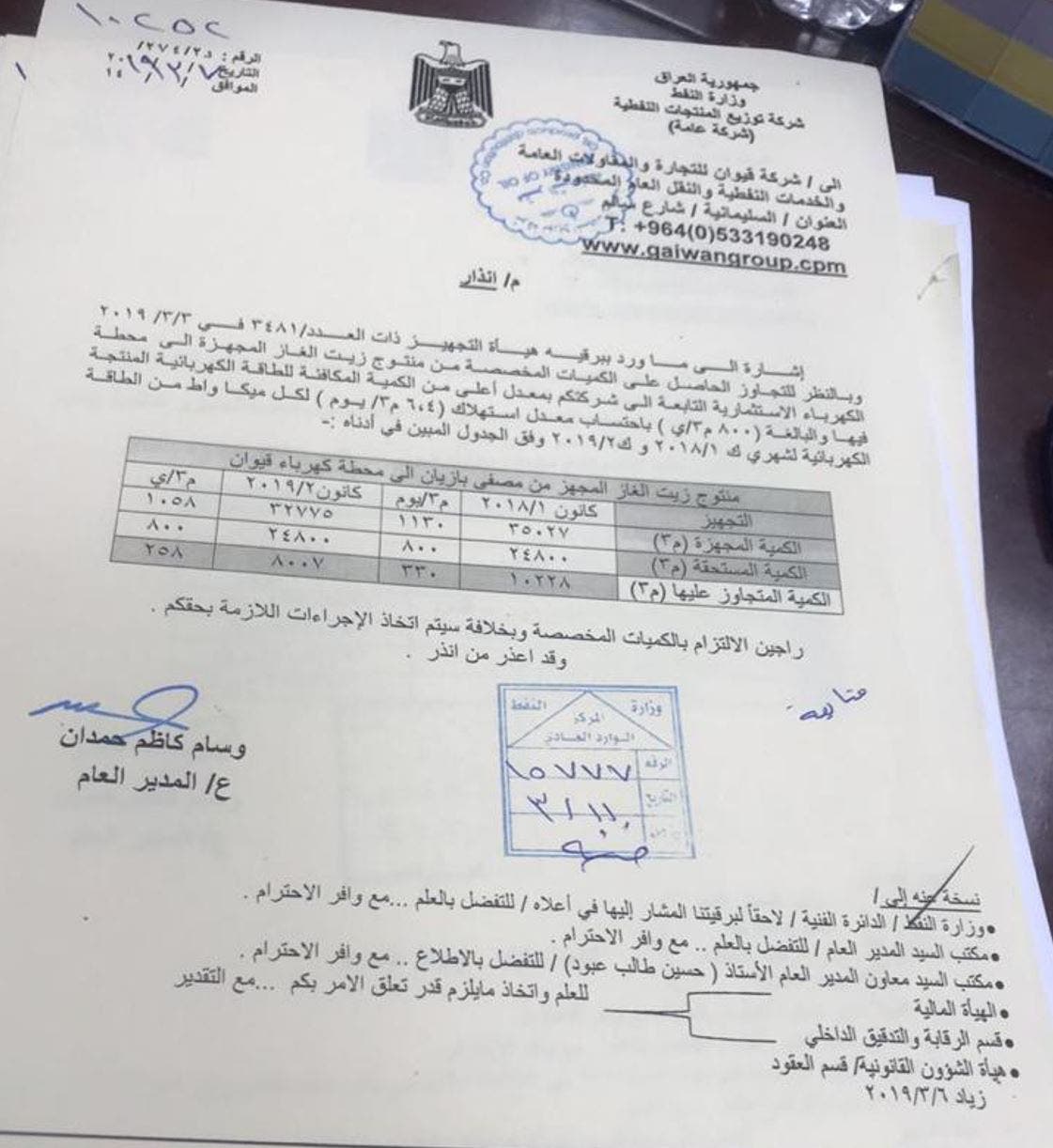 (العربیە) بەڵگەنامەیەکی دەستکەوتووە کە دەریدەخات وەزارەتی نەوت لە مارسی ٢٠١٩دا بەبڕی (٣٣ ملیۆن) دۆلار سزای دارایی بەسەر کۆمپانیای "قەیوان"دا سەپاندووە، ئەمەش بەهۆی یاریکردنی بە تایبەتمەنی وەبازاڕخستنی نەوتەوە.