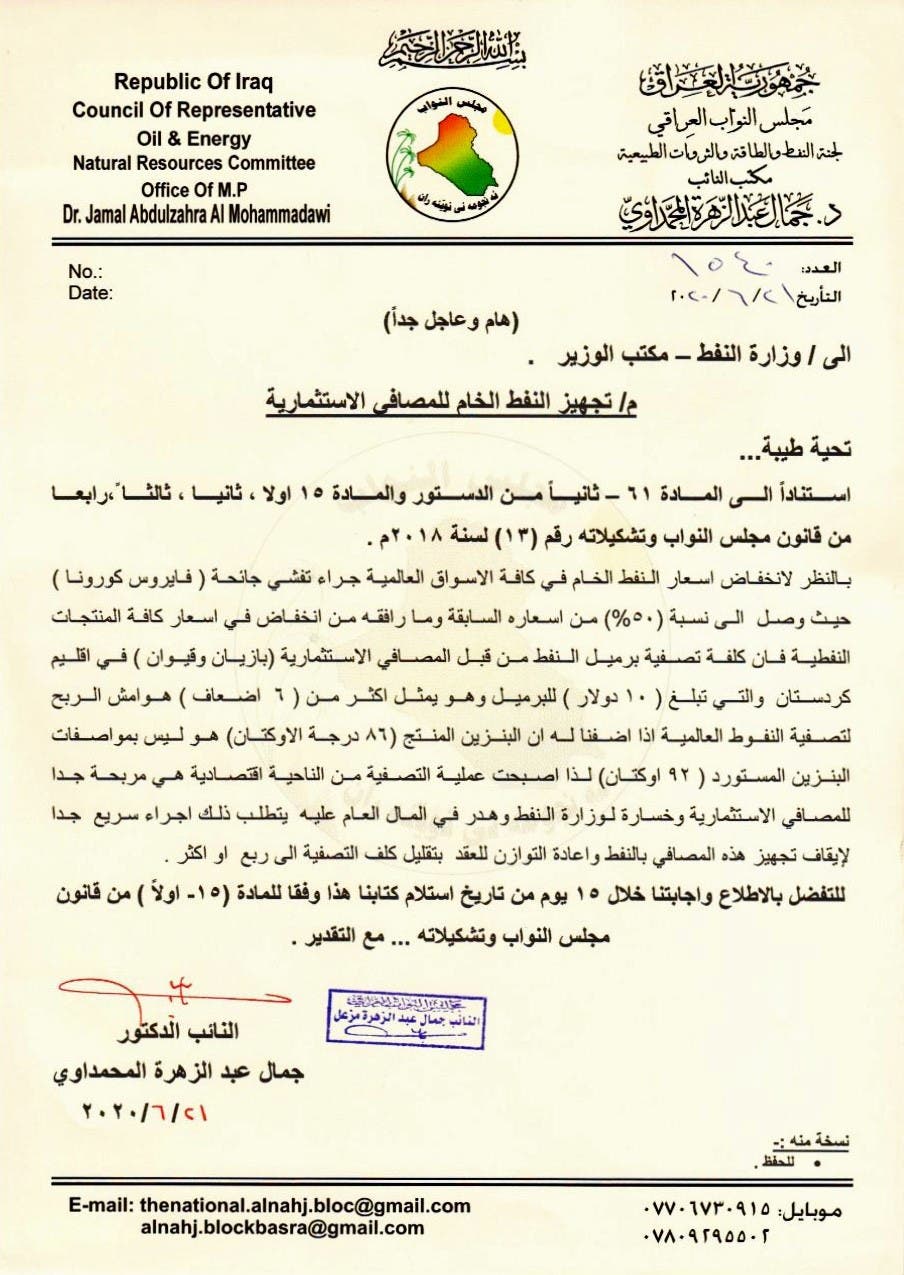 سەرباری ئەمە، لە ٢١ی حوزەیرانی ٢٠٢٠دا ناڕەزایەتی لە لیژنەی نەوت و وزەی پەرلەمانی عێراقەوە هاتووە سەبارەت بە گرێبەستی پاڵاوتنی نەوتی خاو لەلایەن کۆمپانیای "قەیوان"ەوە، باسلەوەکراوە پرۆسەی پاڵاوتنەکە بووە بە قازانج بۆ پاڵاوگەکان و زیان بۆ وەزارەتی نەوت و بەهەدەردانی سامانی گشتیی، داواکراوە پێدانی نەوت بە پاڵاوگەکەی قەیوان رابگیرێت و هاوسەنگی بۆ گرێبەستەکە بگەڕێندرێتەوە.